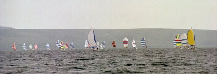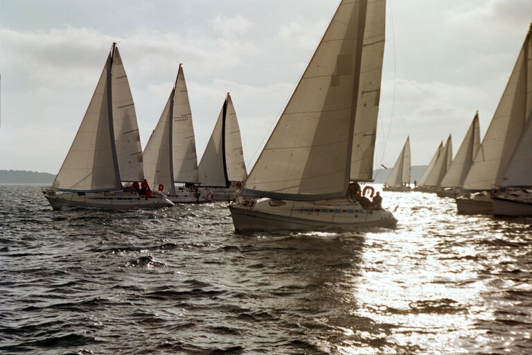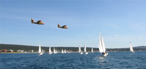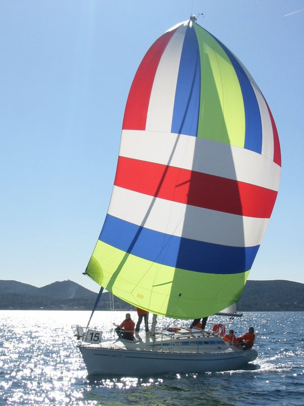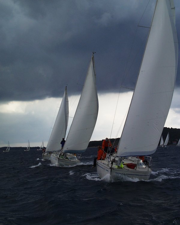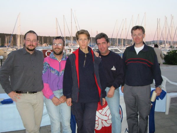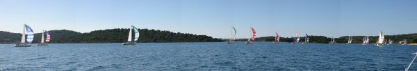 Am Montag wurde - wieder bei zunächst südlichen, aber nicht sehr stetigen Winden - die lange Wettfahrt (Hafeneinfahrt Marina Sukosan - Rt Skoljic nahe Nevidanje - rund Osljak - Hafeneinfahrt) gestartet. Bald nach dem gelungenen Start drehte der Wind zunächst auf Ost, das Feld zog sich weit auseinander. Kurz darauf drehte der Wind im nördlichen Teil des Feldes auf Nord, sodaß die anfangs weit zurückliegenden Boote unter Spinnaker die Verfolgung der über zwei Meilen vorausliegenden, noch immer hart am Wind segelnden Boote aufnehmen und den Abstand wesentlich verringern konnten. Noch vor Erreichen der festen Bahnmarke Rt Skoljic drehte der Wind wieder auf Südost und nahm Gewitter-artig zu; trotz der anfangs großen Ausdehnung des Feldes passierten dann alle Boote die erste Bahnmarke innerhalb von 8 Minuten. Unter Spinnaker ging es dann Richtung Osljak, nahe Zadar. Bei nachlassenden Winden wurden wiederum die Karten vollständig neu gemischt: Die führenden Boote kamen vor Osljak in eine Flaute und standen mit herunterhängendem Spinnaker, während einige Boote, die einen Kurs näher an Ugljan gewählt hatten, Osljak mit zunächst großem Vorsprung rundeten. Zuerst wieder unter Spinnaker auf Kurs zurück nach Sukosan mußten bei Windrehern auf Südost die Spinnaker rasch geborgen werden; das Ziel wurde dann hart am Wind erreicht. Nach sechs Stunden Wettfahrt über 20 sm passierten alle Boote innerhalb von etwa 30 Minuten das Ziel.