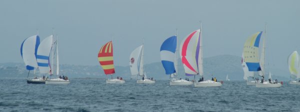 Erster Wettfahrttag war dann der folgende Donnerstag. Um 1130 Uhr fanden sich 32 Skipper, Wettfahrtleitung und Organisatoren zum Briefing ein. Regattaleiter Blondl Schmidleitner begrüßte die Teilnehmer und gab die letztgültigen Segelanweisungen aus. Kurz darauf wurde abgelegt, 32 Elan 333, ein Schlauchboot und eine fast 16 m lange Atoll 6 - das Startschiff - nahmen südlichen Kurs, in den Kanal vor dem alten Stadthafen von Biograd. Die Bojen wurden zu einem Dreieckskurs von gut 2 Meilen ausgelegt, und flott wurde von der Wettfahrtleitung gestartet.