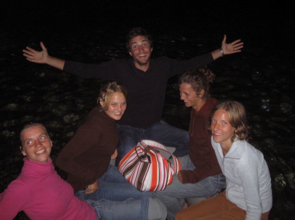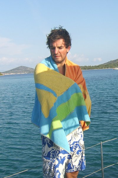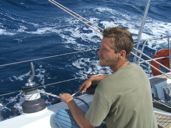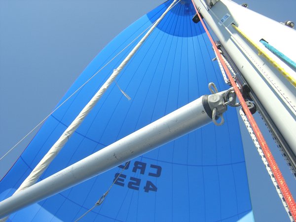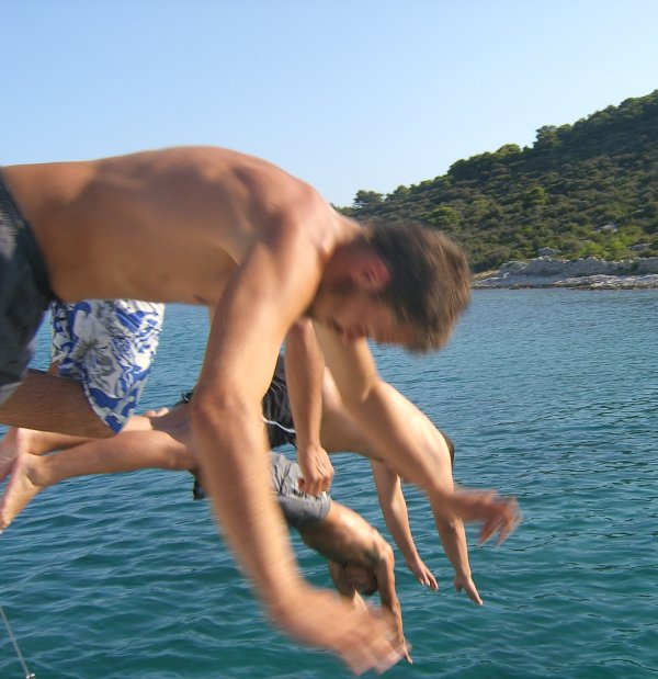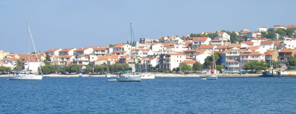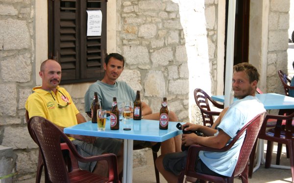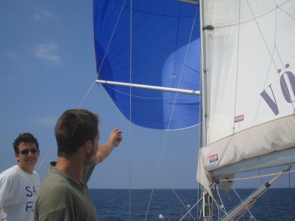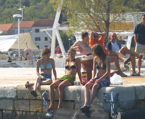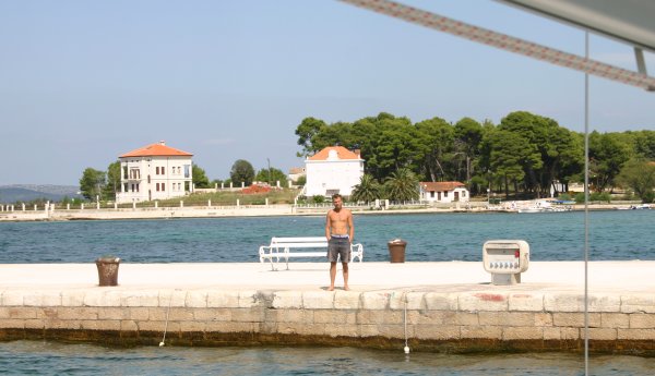 Am Sonntag erreichten wir Ancona gegen 1300 an. Nach vergeblicher Suche nach dem Hafenkapitän, bei völligem Desinteresse aller öffentlichen Organe an uns und unsere Überfahrt, legten wir uns für eine Stunde und ein gutes Mittagessen an die Zollmole. Kurz nach 1400 brachen wir auch schon wieder auf Richtung Kroatien, wobei wir unser Ziel noch nicht festlegten, sondern vom (noch erwarteten) Wind abhängig machten. Auf diesen Wind mussten wir länger warten, er kam kurz nach Mitternacht aus nordöstlicher Richtung auf. Wir entschieden uns daher für Primosten, das bei anhaltenden Windverhältnissen leicht zu erreichen war. Und um 0900 waren wir dann auch dort. An diesem Montag konnten wir dort nicht einklarieren; wir wurden in die Marina Kremik geschickt, wohin extra für uns Kapetanja, Polizei und Zoll aus Sibenik kamen. Nach dieser kurzen Unterbrechung legten wir ab und der Winddreher auf schwachen Scirocco passte uns ganz gut in den Plan Richtung Norden. Zuerst aber nutzten wir die guten Segelbedingungen und übten wenden, halsen und reffen, bis wir uns neben dem Leuchtfeuer Mulo wiederfanden. Dort konnten wir endlich unseren Spinnaker (angeblich 130 m2) ausprobieren und genossen bei auffrischendem Wind die neidisch-neugierigen Blicke der entgegenkommenden und die „Nichtblicke“ der überholten Boote. Nachdem wir den Spi geborgen hatten, war gerade noch genug Zeit für paar weitere Manöver, bis dann ein Gewitter knapp an uns vorbeischrammte und der Wind fast vollkommen einschlief. Trotzdem segelten wir dann– zum ersten Mal unter Vollzeug – in die Nordbucht von Zlarin, wo wir ein nah befreundetes Boot, die „Mljet“ (drei Mädchen, Skipper Maria), trafen und die erfolgreichen ersten Tage gemeinsam feierten.