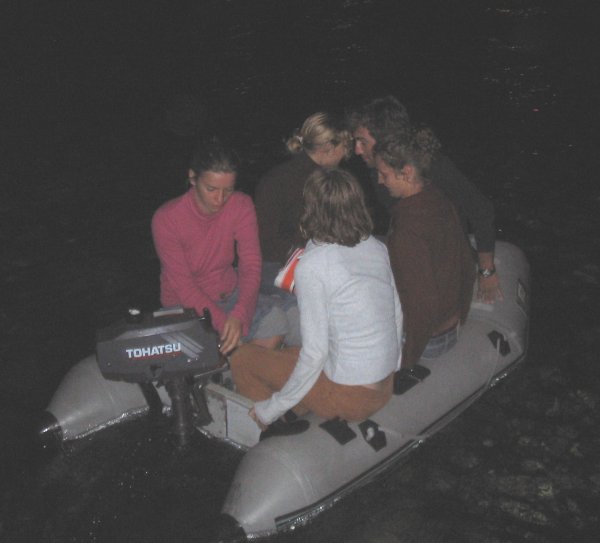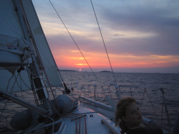 Für uns (Claudia, Bernd, Christopher, Lukas und Lukas, Claudio) hieß es also Samstag in der Früh auf Richtung Kroatien, mit dem Hintergedanken, neben dem Segeln vielleicht auch noch die Vorzüge der warmen Jahreszeit ein wenig nutzen zu können. Stützpunkt des NCP ist die Marina Mandalina auf der Halbinsel im Süden des Beckens von Sibenik. Wir kamen schon gegen Mittag an und entschieden uns, durch die Altstadt von Sibenik zu schlendern. Inzwischen war das Boot fertig zur Übernahme, die übrigens völlig problemlos über die Bühne gegangen ist. Auch jede von uns gewünschte Ausrüstung für die Überfahrt nach Italien (Rettungsinsel) und zum Spinnakern (Spi, doppelte Schoten samt Blöcken!) wurde uns anstandslos übergeben. Nach dem Setzen des Clubstanders waren wir am Nachmittag fertig zum Auslaufen. Unser erstes Ziel hieß Ancona und aus mehrerlei Gründen nicht San Benedetto: Erstens ist es schön, wieder einmal etwas Neues auszuprobieren und außerdem wollten wir mit unseren 2,5 Meter Tiefgang in der seichten Einfahrt von San Benedetto keine „Pionierarbeit“ leisten. Wir legten also um 1730 ab Richtung Hafenkapitän Sibenik, um 1815 waren alle Formalitäten erledigt und an der Ausfahrt Sveti Ante setzten wir Segel. Bei schwachem NE-Wind fuhren wir Richtung Sonnenuntergang. Obwohl der Wind nie stärker als 3 Bft blies, mussten wir auf unserem Amwindkurs zwischen Tijat und Zmajan das Groß schon einmal reffen, um nicht so oft aus dem Ruder zu laufen und auch unsere Fahrt durchs Wasser bestätigte die Sportlichkeit unseres Bootes: 8 Knoten Windgeschwindigkeit, 7 Knoten Bootsgeschwindigkeit. So „glitten“ wir mit wenig Wind - schneller als erhofft - Richtung Westen. Gegen 0300 schlief der Wind dann ein und wir mussten die restliche Überfahrt mit dem Motor hinter uns bringen, was den Vorteil hatte, dass unsere relativ schwachen Batterien geladen wurden, die uns im Laufe des Törns noch beschäftigen würden.