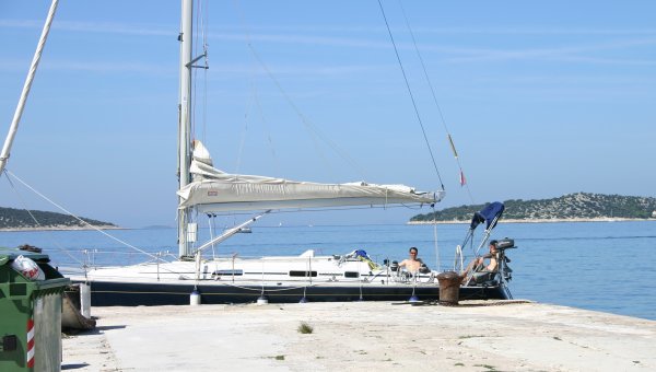 Ein letzter Crew-Wechsel, die Wiener Kollegen – jetzt alle mit Führerschein – legen ab Richtung Heimat, die verbleibende Crew (Claudio, Bernhard, Reinhard und Markus) genießt einen ruhigen Segeltag bei sommerlichem Schönwetter. Eine kleine Mittagspause in Sepurine erinnert (uns?) an das Kroatien der 70 er Jahre, sonnig und warm, beschaulich bis verschlafen (ein Genuss, den es heute nicht mehr gibt), nur gestört durch Preis von über 20 Kuna pro Bier. Als starker Abschluss gehen wir unter Segel, machen noch etwas Weg gegen den Wind, setzen dann den Spi und fahren unter Spi durch den Sveti Ante, bis ganz nahe zur Tankstelle.