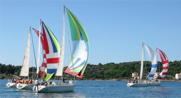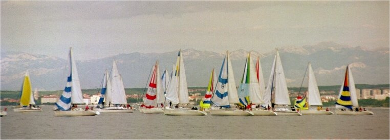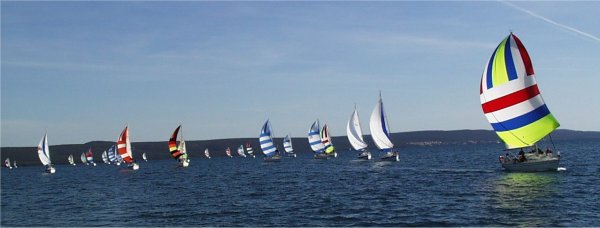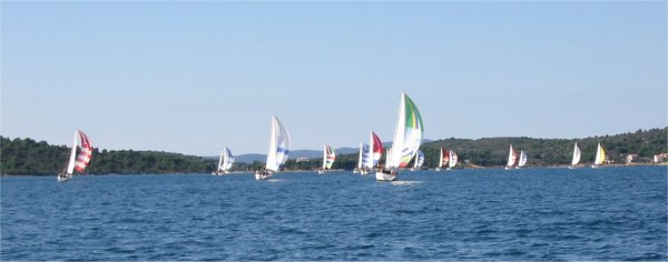 Am Montag wurde - wieder bei zunächst südlichen, aber nicht sehr stetigen Winden - die lange Wettfahrt (Hafeneinfahrt Marina Sukosan - Rt Skoljic nahe Nevidanje - rund Osljak - Hafeneinfahrt) gestartet. Bald nach dem gelungenen Start drehte der Wind zunächst auf Ost, das Feld zog sich weit auseinander. Kurz darauf drehte der Wind im nördlichen Teil des Feldes auf Nord, sodaß die anfangs weit zurückliegenden Boote unter Spinnaker die Verfolgung der über zwei Meilen vorausliegenden, noch immer hart am Wind segelnden Boote aufnehmen und den Abstand wesentlich verringern konnten. Noch vor Erreichen der festen Bahnmarke Rt Skoljic drehte der Wind wieder auf Südost und nahm Gewitter-artig zu; trotz der anfangs großen Ausdehnung des Feldes passierten dann alle Boote die erste Bahnmarke innerhalb von 8 Minuten. Unter Spinnaker ging es dann Richtung Osljak, nahe Zadar. Bei nachlassenden Winden wurden wiederum die Karten vollständig neu gemischt: Die führenden Boote kamen vor Osljak in eine Flaute und standen mit herunterhängendem Spinnaker, während einige Boote, die einen Kurs näher an Ugljan gewählt hatten, Osljak mit zunächst großem Vorsprung rundeten. Zuerst wieder unter Spinnaker auf Kurs zurück nach Sukosan mußten bei Windrehern auf Südost die Spinnaker rasch geborgen werden; das Ziel wurde dann hart am Wind erreicht. Nach sechs Stunden Wettfahrt über 20 sm passierten alle Boote innerhalb von etwa 30 Minuten das Ziel.