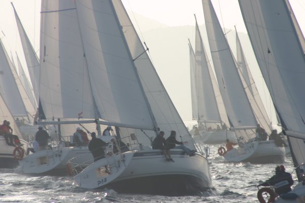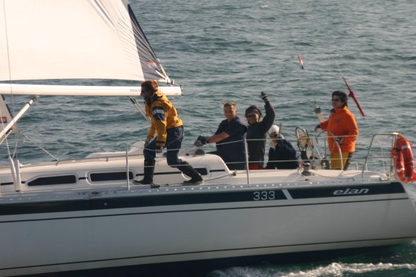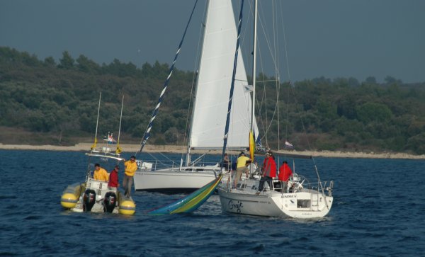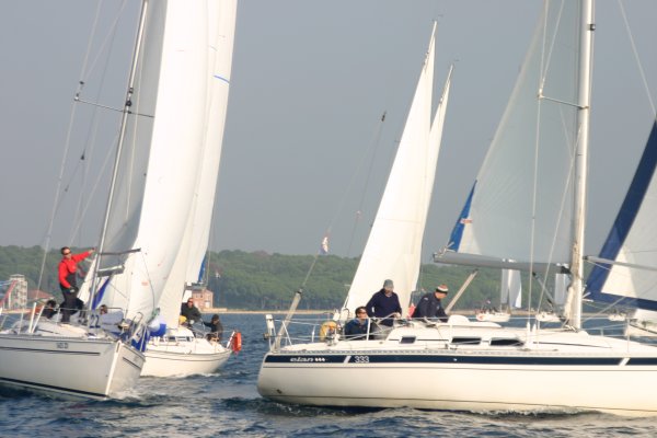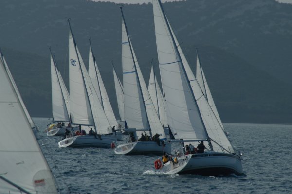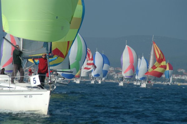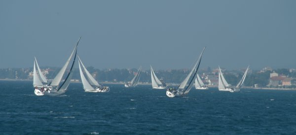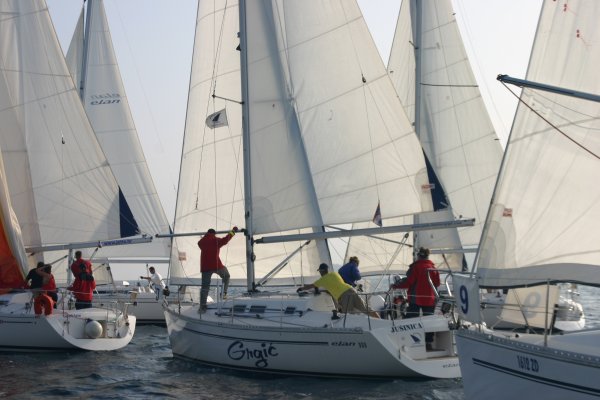 Erster Wettfahrttag war dann der folgende Donnerstag. Um 1130 Uhr fanden sich 34 Skipper, Wettfahrtleitung und Organisatoren zum Briefing ein. Commodore Vrecer begrüßte die Teilnehmer und Regattaleiter „Blondl“ Schmidleitner gab die letztgültigen Segelanweisungen aus. Kurz darauf wurde abgelegt, 34 Elan 333, zwei Schlauchboote und ein Motorboot Edership 39 „ASMO“ als Startschiff nahmen südlichen Kurs, in den Kanal vor dem alten Stadthafen von Biograd. Die Bojen wurden zu einem Dreieckskurs von ca. 3 Meilen ausgelegt, und flott wurde von der Wettfahrtleitung gestartet.