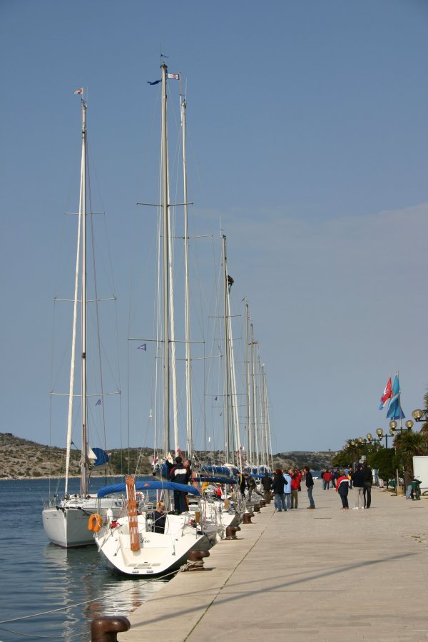 Noch bevor es finster wurde, waren fast alle Clubstander gesetzt und die Jachten waren auslaufbereit zu kleinen Nachtinselrundungen oder zu einem Ausflug nach Skradin. Am Sonntag wurde an der langen Mole von Sibenik fleißig geübt und zeitweise war auch die Sonne zu sehen. Das Ausklarieren (von 10 Booten) am Nachmittag wurde von den Hafenbehörden sehr freundlich und sehr genau - wie eben in internationalen Häfen üblich - durchgeführt.