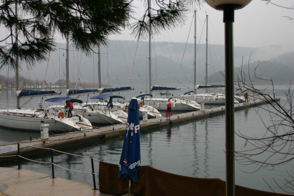 Nach Ende der Regatta trafen sich die meisten Boote noch in Skradin; ein Stegfest konnte auch vom wiedergekehrten Regen nicht ganz verhindert werden.