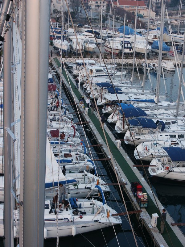 Das Einklarieren in Split gestaltete sich wieder freundlich und höflich, aber eben international. Nach mehreren Manövern (zum Teil am Paket) gab es Plätze im Schwell an der Außenmole der ACI Marina. Am nächsten Tag - leider wieder ohne Wind - konnten die Hafenmanöver weiter vertieft werden, dann startete die Nachteinsteuerung. Festland, Brac, Solta, Drvenik, alle Häfen in der Umgebung waren Ziel der Flotte, bis sich dann alle Boote im Regen in Rogoznica trafen und dort an den bereits zu dritt am Paket liegenden Booten der YCA Crew Tauern mit Commodore Ing. Breitenstein festmachten. Nach dem Auslaufen der Kollegen vom YCA gab es noch eine kleine Übung mit einem 5er-Paket.