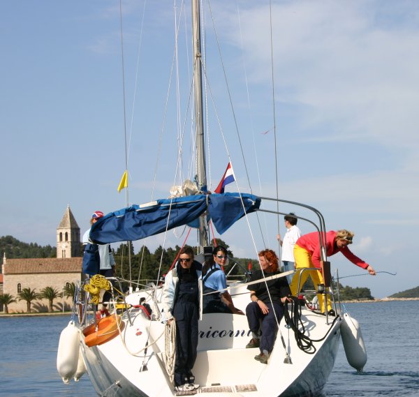 Der 27. Übungstörn begann nach einer einfachen Anfahrt nach Vodice und nach Sibenik bei ruhigem Wetter und etwas Sonne ganz ohne Probleme. Herr Hummel war persönlich vor Ort und kümmerte sich um uns - wie gewohnt verlief alles reibungslos. Sechs Elan 431, die First 47.7 und die Sun Odyssey 45.3 standen bereit, nach kurzer Zeit waren die Vorräte gestaut, die Boote auslaufbereit. Wie jedes Jahr absolvierten einige Interessenten die Prüfung zum "Uvjerenje" - mit Erfolg, allerdings diesmal um € 140,--. Jasmina von der Basis betreute die Kandidaten bestens, die Ausweise konnten nach Törnende abgeholt werden.