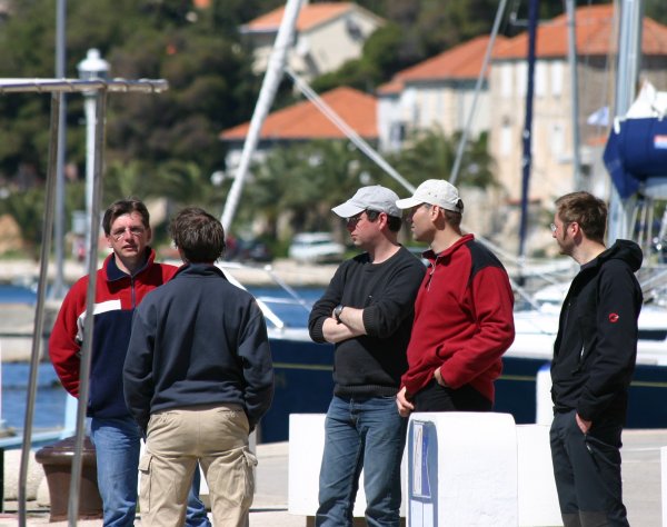 Nach einer kurzen fröhlichen Nacht (Duschen waren ab 0600 Uhr in Betrieb) wurde noch geplaudert, dann liefen die Boote im Laufe des Vormittags aus, um zwischen Brac, Solta und Split Segelmanöver zu üben. Mit Einbruch der Dunkelheit ging es dann an die Einsteuerungen; anders als in den Vorjahren wurde Brac nicht gerundet, die Boote verteilten sich im Splitski Kanal, von Omis über Supetar, von Split bis Trogir und Drvenik wurde navigiert und gepeilt. Bei Bora bis gut 4 Bft ging es dann im Morgengrauen Richtung Rogoznica, wo sich beachtliche Pakete bildeten.