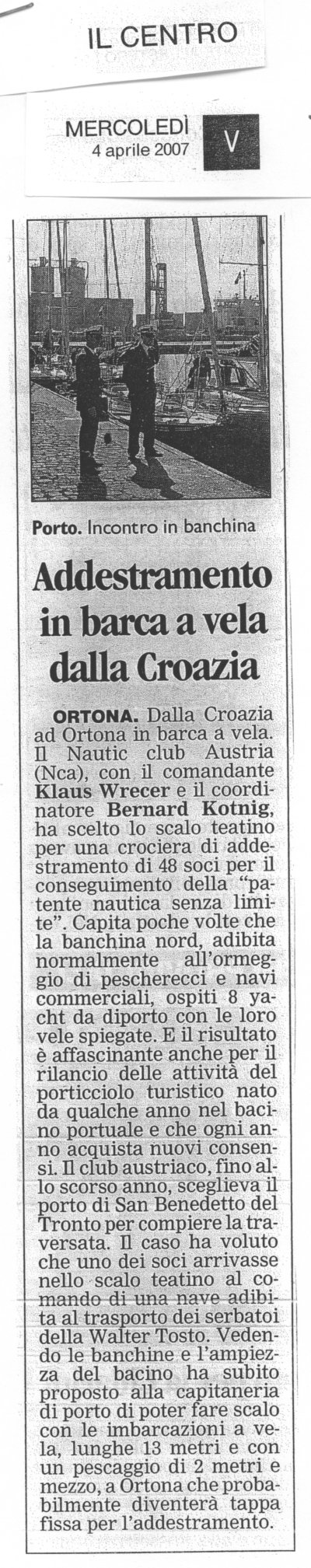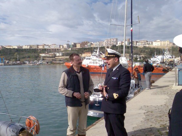 Bei Wind aus SE (20 - 25 kn) und einer gut spürbaren See konnte etwa die halbe Strecke nach Ortona von allen Booten unter Segel zurückgelegt werden, der Rest unter Motor, jedoch wie immer unter Verzicht auf elektronische Navigationsgeräte. Gegen 0800 Uhr erreichten die ersten Boote den Hafen, am Fuße schneebedeckter Berge, im hellen Sonnenschein. Nach einem ersten Mißverständnis legte Grbavac, das Boot der Damencrew, zuerst an der Mole der Großschiffahrt an und wurde dort von Kapitän Angelo Capuzzimato und seinen Leuten freundlich willkommen geheißen. Es folgten dann die Boote, die als Erste angekommen waren (Skalice/Kratky und Nina/Luidolt) und bereits vorher bei der Lega Navale festgemacht hatten und nun verlegten, schließlich kam dann bis etwa 1100 Uhr auch noch das letzte Boot. Nach der etwas anstrengenden Überfahrt gab es eine kurze Erholungspause. Kapt. Capuzzimato sprach dann eine Einladung zum Besuch der Capitaneria aus, der Viktoria und Bernhard Kotnig, sowie Robert Muhr folgten. Vom obersten Chef der Capitaneria wurde im Zuge eines Gesprächs (er ist selbst Segler und hat sein Boot bei der Lega Navale stationiert) eine Flasche speziellen Weins als Gastgeschenk überreicht. Im Anschluß daran lud Kapt. Capuzzimato in sein Büro und präsentierte dort mit Stolz den Stander des NCA, den wir ihm schon 2007 überreicht hatten. Er übergab uns dann eine Kopie eines Artikels der Zeitung "Il Centro", der anläßlich unseres Besuches 2007 erschienen war.