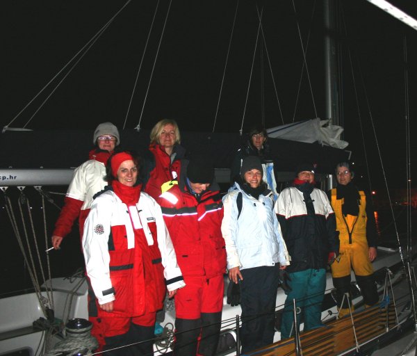 Punktlich um 1200 Uhr startete die Wettfahrt und nach dem Überfahren der Linie auf achterlichem Kurs - einige Boote hatten sogar den Spinnaker gesetzt - blies hinter der Abdeckung eine ziemlich frische Bora hervor. Zum Teil gut über 20 (und mehr) kn veranlaßten die meisten Boote stark zu reffen. Der Kurs ging wieder über Hrbosnjak zum Lf Rozenik, wo das erste Boote, die Kety mit der Crew Helmut Leykauf, nach knapp 2 h 49 min eintraf, gefolgt von den beiden Bavarias Crew Vrecer und Crew Mayr. Dann folgten Stribor (Crew Michaelis), Skalice (Crew Kratky) und Mala (Crew Königshofer).