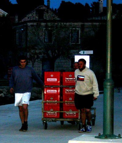 Der Empfang durch die Behörden in Vis war wieder sehr freundlich - der Hafenkapitän kennt den NCA schon seit mehreren Jahren, allerdings auch wie immer mit einiger Schreibarbeit verbunden. Die Flotte lag dann - jetzt wieder vereint mit den Booten, die auf die Überfahrt verzichtet hatten - an der Mole des schönen alten Hafens, wo diesmal kassiert wurde. Die "Anlege-Gebühren" sind hoch, es konnte aber - aufgrund der Größe der Flotte und der kurzen Anlegedauer ein reduzierter Gesamtpreis verhandelt werden. "Flottenkassier" Andreas Leeb war dann (wie auch schon in Sibenik, später dann in Milna und in Zlarin) einige Zeit mit dem Eintreiben der einzelnen Anteile beschäftigt. Nach einigen Anker-, Muring-, Anlegemanövern setzte sich die Gruppe Richtung Milna in Bewegung. Der Wind war schwach, jedoch ausreichend für einige Meilen unter Spinnaker.